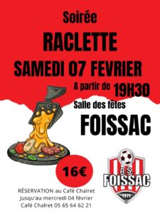 Le samedi 07 février aura lieu la traditionnelle soirée raclette du club de foot à la salle des fêtes de Foissac🥔🧀🍻