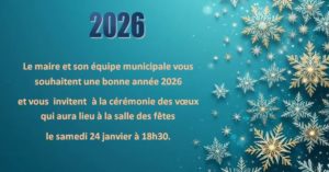 Le Conseil Municipal se réunira le mardi 27 janvier 2025 à 20 heures 30, salle de la Mairie.